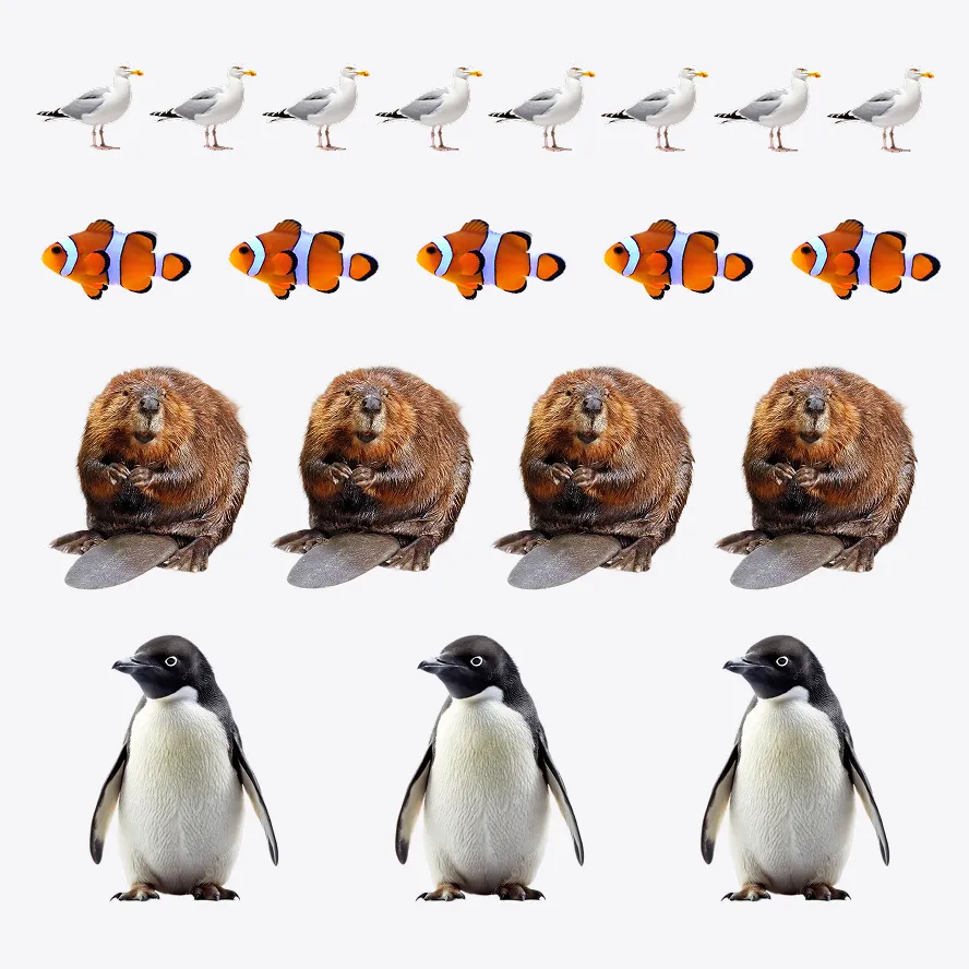 8 альбатросов, 6 ежей, 5 рыб, 4 бобра и 3 пингвина