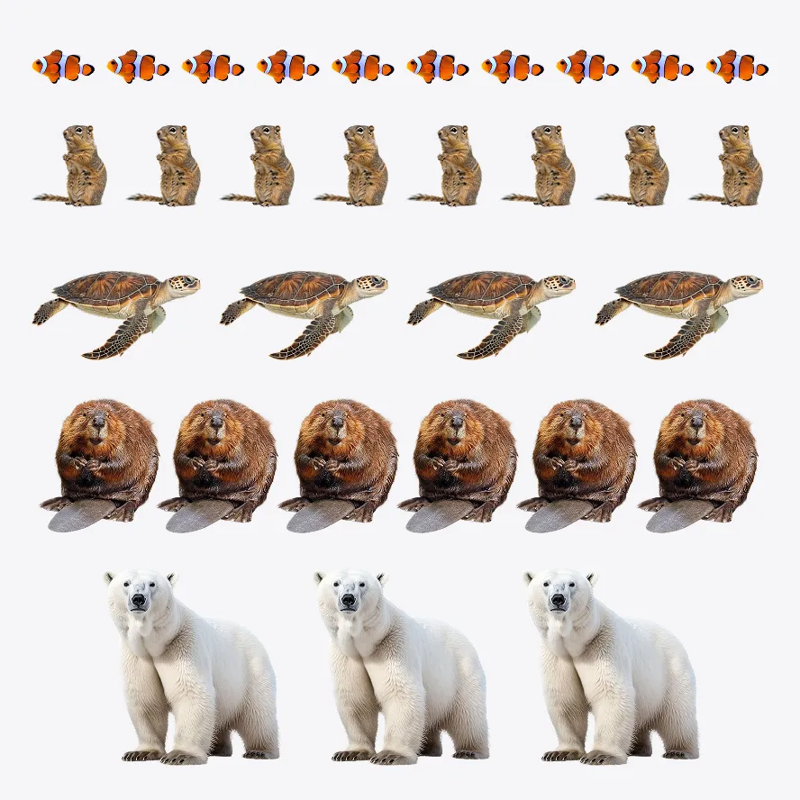 10 коралловых рыб, 6 бобров, 8 сусликов, 4 черепахи и 3 белых медведя