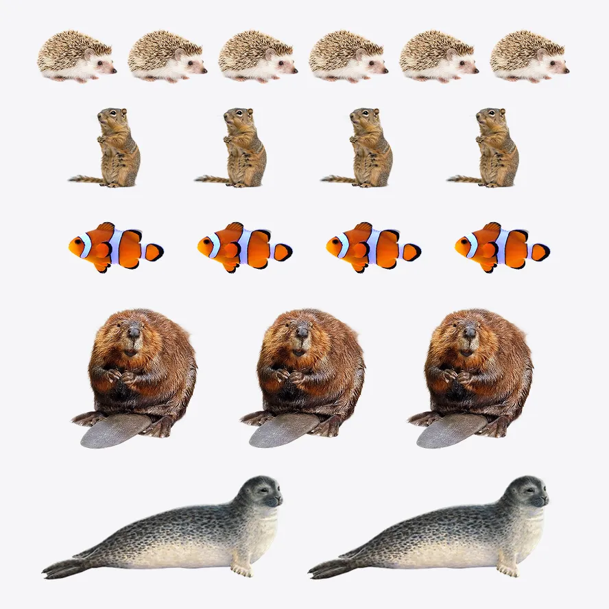 6 ежей, 4 суслика, 4 рыбы, 3 бобра и 2 тюленя
