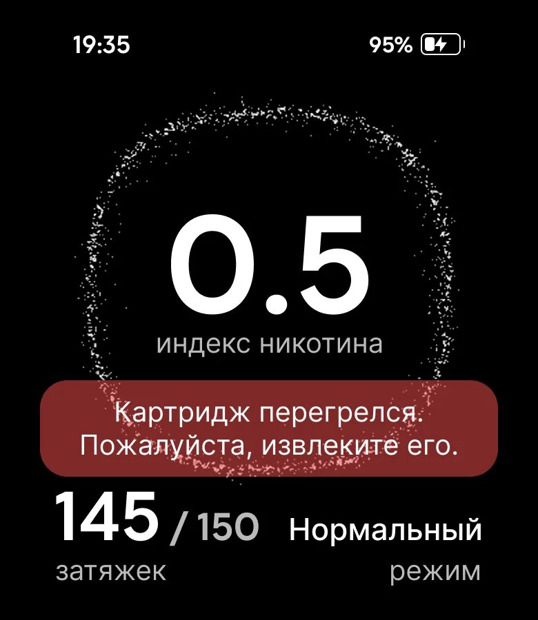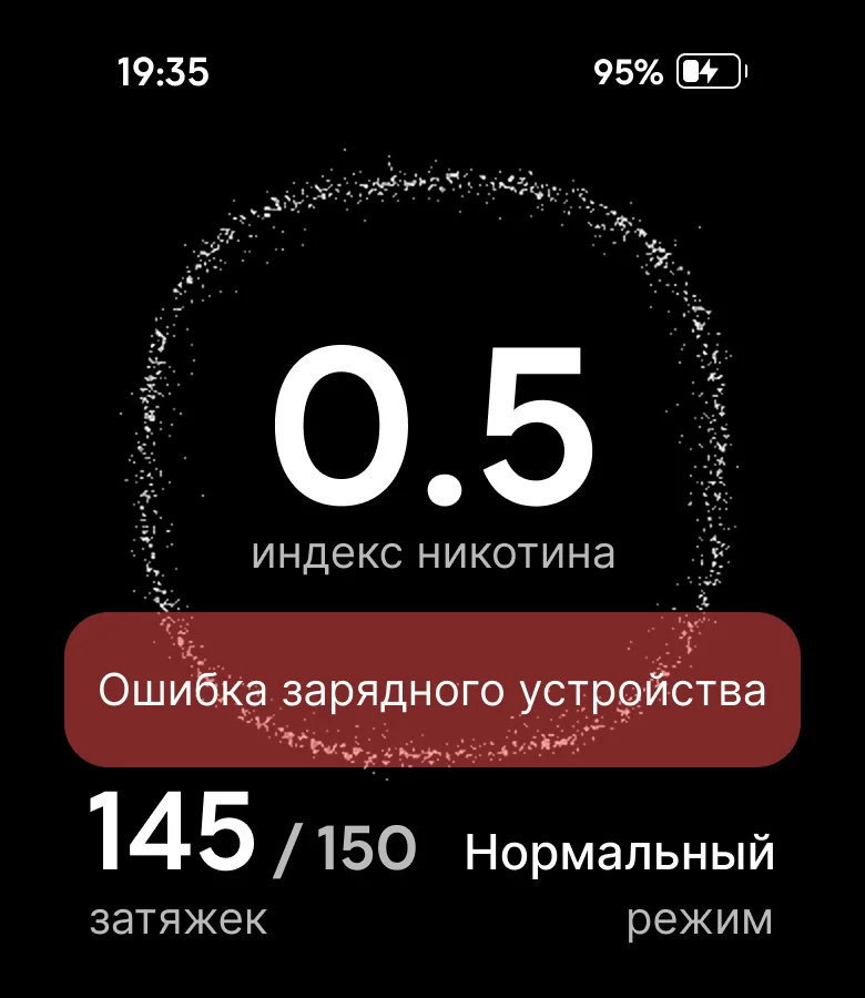 Расчёт оставшегося количества затяжек индивидуален для каждого пользователя и основывается на средней продолжительности одной затяжки за последние 14 дней и текущем уровне мощности. Данное значение не отображается, если картридж не установлен.