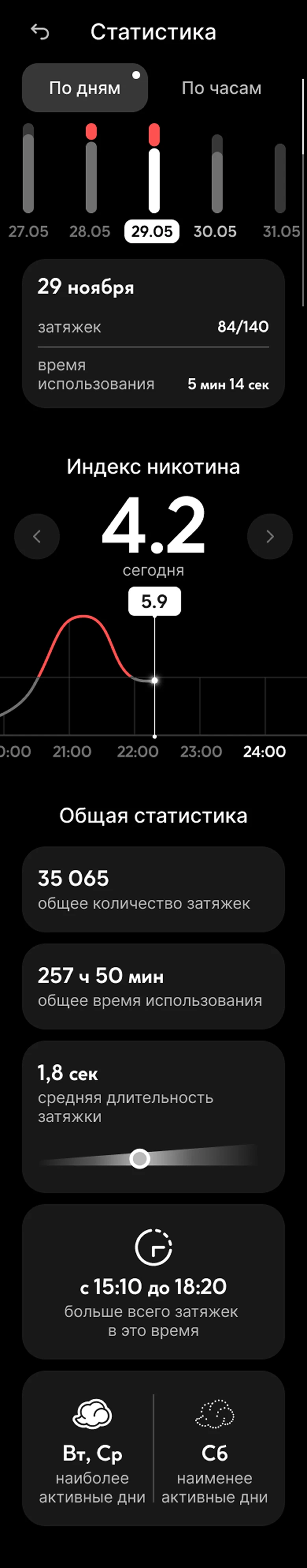 В общей статистике отображется количество затяжек и время использование за всё время. Ниже отображается средняя длительсть затяжки, время, в которое обычно совершается наибольшее количество затяжие, и наиболее и наименее активыне дни.