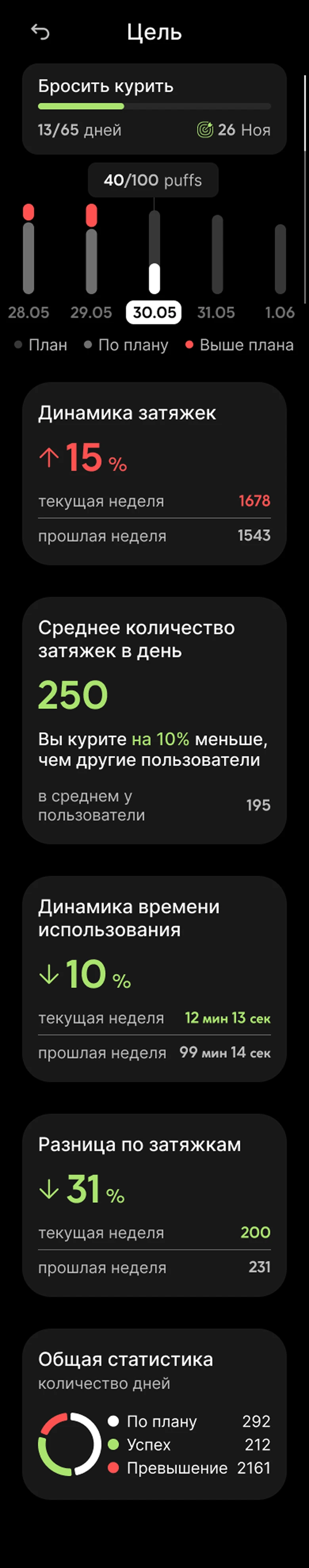 После формирования плана достижения цели устройство предоставит рекомендуемое количество затяжек на каждый день.